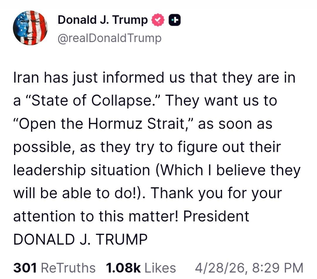 "Iran hat uns soeben mitgeteilt, dass er sich in einem 'Zustand des Zusammenbruchs' befindet. Er fordert uns auf, die Straße von Hormus so schnell wie möglich zu öffnen, während er versucht, seine Führungssituation zu klären."